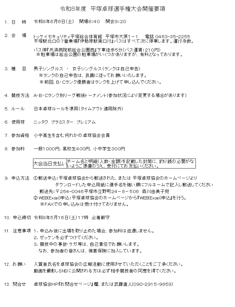 〇郵送申込:平塚卓球協会から郵送された、または平塚卓球協会の