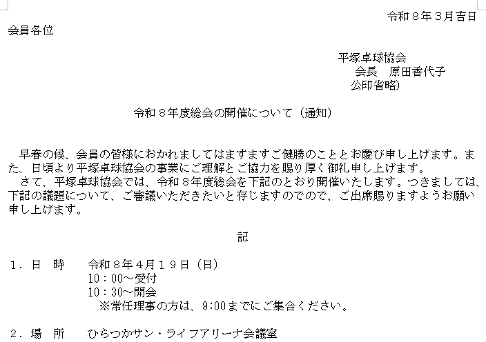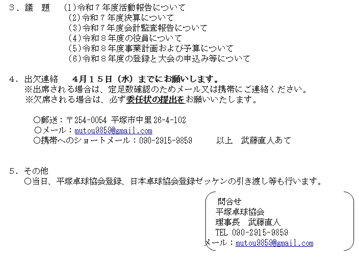 R8平塚卓球協会登録書類ダウンロード R8総会委任状ダウンロード R8総会の案内ダウンロード 投稿ナビゲーション ★小学生卓球教室(日時:3/26(木)-27(金), 申込期限:3月25日(水)まで延長)